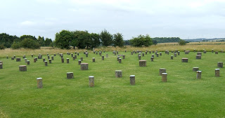 The concrete posts mark the location of six concentric rings of post-holes. The rings are oval and orientated towards the rising sun on Midsummer Day. The tops of the posts are painted in different colours to indicate which ring they belong to. The rings are too close together to be roof supports.